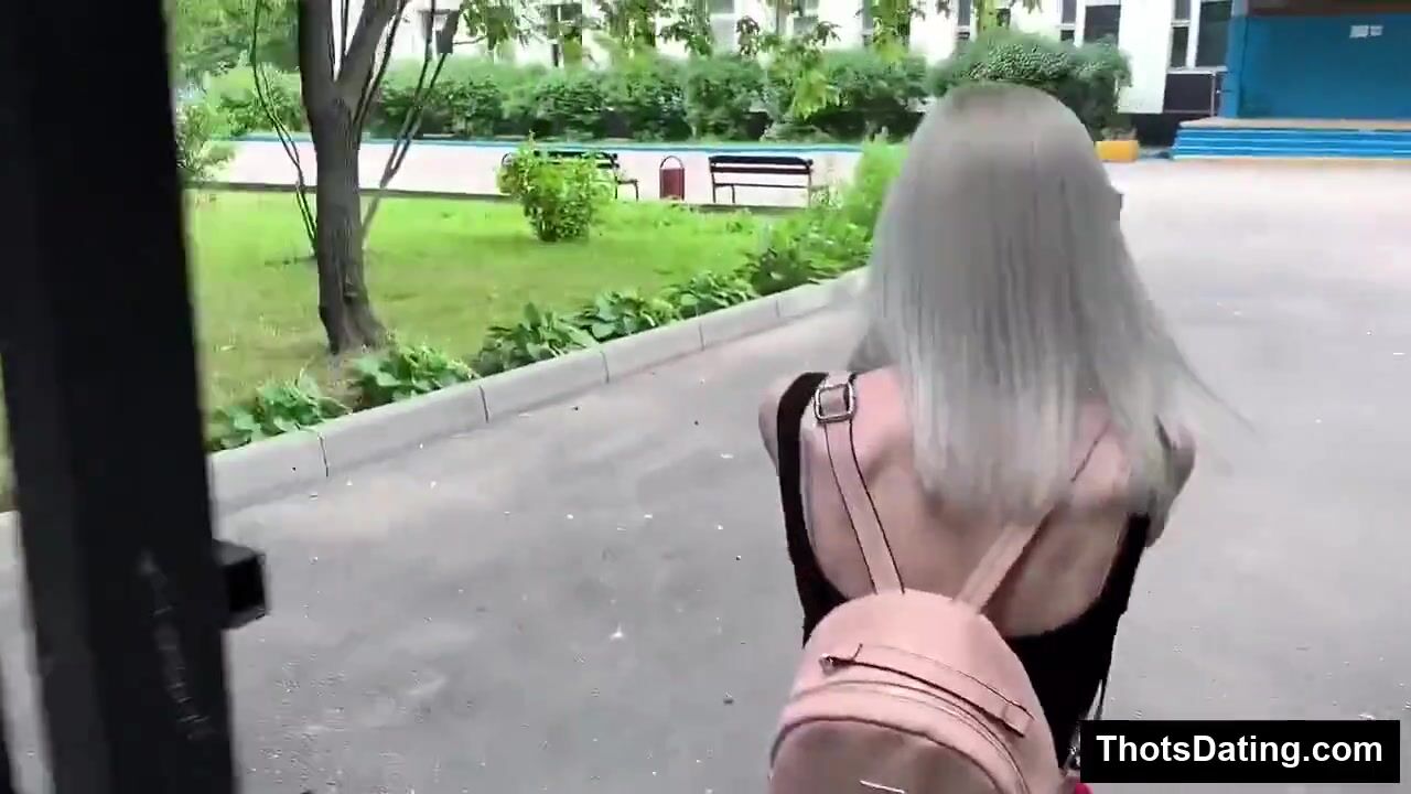 Video starts with long-haired woman in pink backpack, black top, red skirt strolling green schoolyard near trees and building. Cuts to close-up hands on large erect penis, then blonde teen kneeling in tight space, passionately sucking and licking cock from below. Man in gray shirt stands over her. Multiple angles of sloppy oral action on balcony with pink walls.